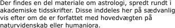 The natural Sciences A good deal of material on astrology is scattered throughout the academic journals. These are divided into the natural sciences and the human sciences Within the natural sciences we find an interesting material on chemestry and physics, dating from 1947 to 1990. material on other sciences is dated 1974-90. Further investigation is hampered by the scarseness of electronically indexed data previous to 1980. The main portion is quoted from Norwegian Sceptics plus McPhersons paper 'Astrologisk dokumentation' in Horoskopet 4/98 Note: All bibliographies are in reversed cronological order (newest first).